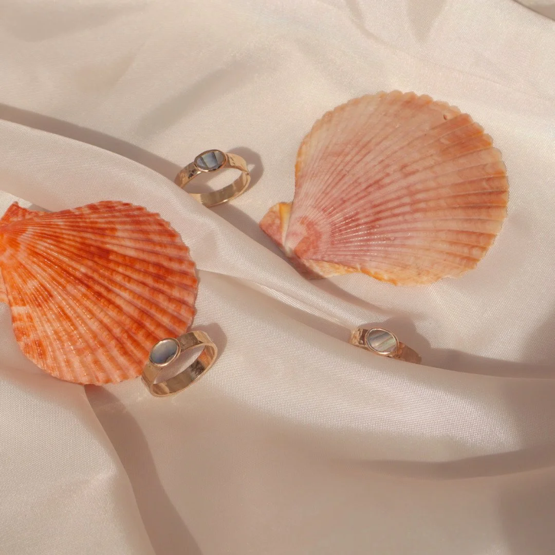 Handmade and hand-hammered for a unique shine, this 14k gold-filled ring features a genuine abalone mother of pearl shell. A timeless piece inspired by the ocean — natural, and made to wear every day.
